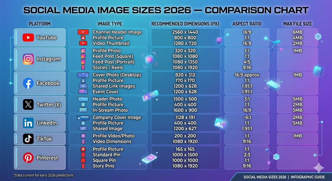 ⚡ Quick Reference — All Social Media Image Sizes 2026